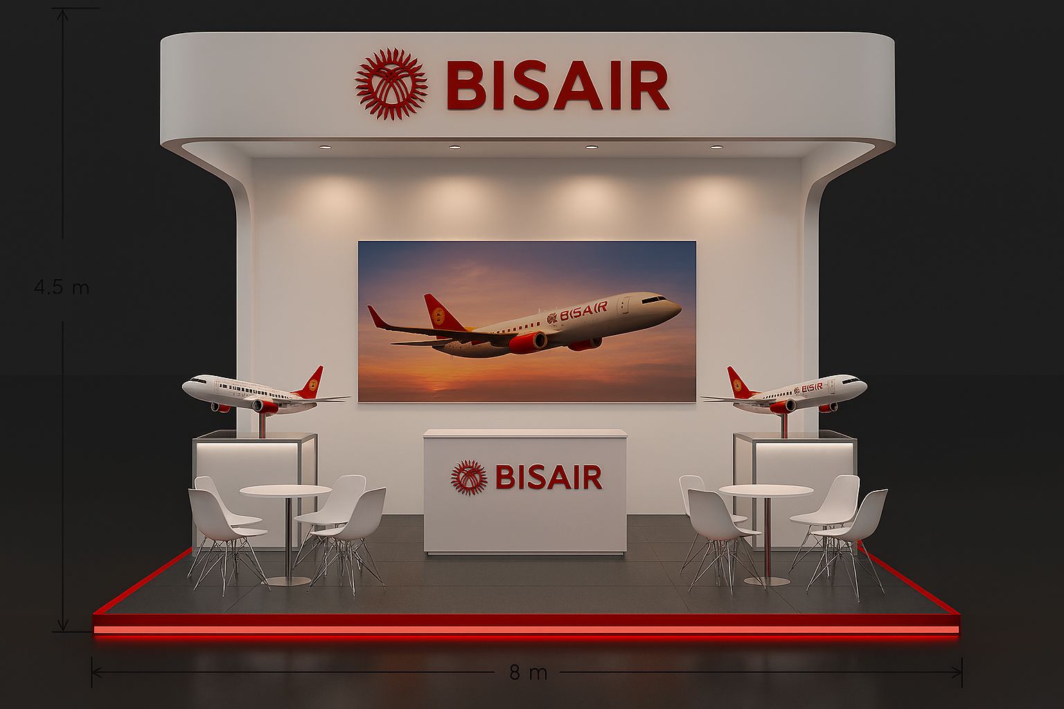 BISAIR Güveni , teknolojiyi , huzurlu yolcuğu sembolize eden bir stand olması adına biz modern tasarım anlayışı ile fonksiyonelliği bir araya getirerek yaşam alanlarına estetik ve konfor kazandıran yenilikçi çizgileri, fonksiyonel yapısı, yenilikçi detaylarıyla ziyaretçilerin ilgisini ilk bakışta üzerine çeken bu stand, markanın dinamizmini ve güvenilirliğini görsel bir dile dönüştürüyor.